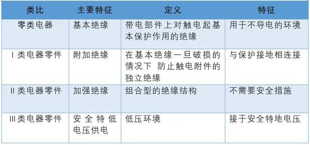 在電動汽車里面,GB/T18384是電動汽車安全要求標準,其分為三部分:車載儲能部分、功能安全和故障防護、人員觸電防護。針對電動汽車的電氣安全提出了一系列的要求,以保證電動汽車在正常使用情況下的一些可能失效不會對使用者和周圍環(huán)境造成危害。在電氣安全標準中,按照絕緣失敗后電擊防護方式的不同可以將電器零件劃分成四類,這四類電器零件的特征如下: