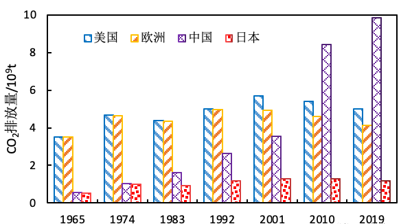根據(jù)2015年12月通過的《巴黎協(xié)定》中提到的長期目標,全球氣溫升高相比工業(yè)化前控制在2℃以內(nèi),力爭控制在1.5℃以內(nèi)。根據(jù)最新研究報告,為控制氣溫升高在1.5℃左右,到2030年左右必須大幅降低碳排放量到2010年的45%。2019年石化能源占全球一次能源利用的84%,CO2排放量為3.42×1010 t,其中我國排放量約占28.6%,我國碳排放量增速為2.5%,高于全球平均水平1.1個百分點,如圖1所示。2019年全球能源消費油當量為144×108t;我國石油與天然氣消費碳排放量分別為15.2×109t和5.9×109t,占全國總排放量的21%。據(jù)2021年世界能源統(tǒng)計數(shù)據(jù)顯示,2020年我國CO2排放總量位居世界第一,其中石化行業(yè)CO2排放總量占比較大,石化行業(yè)碳減排迫在眉睫,同時面臨巨大挑戰(zhàn)。