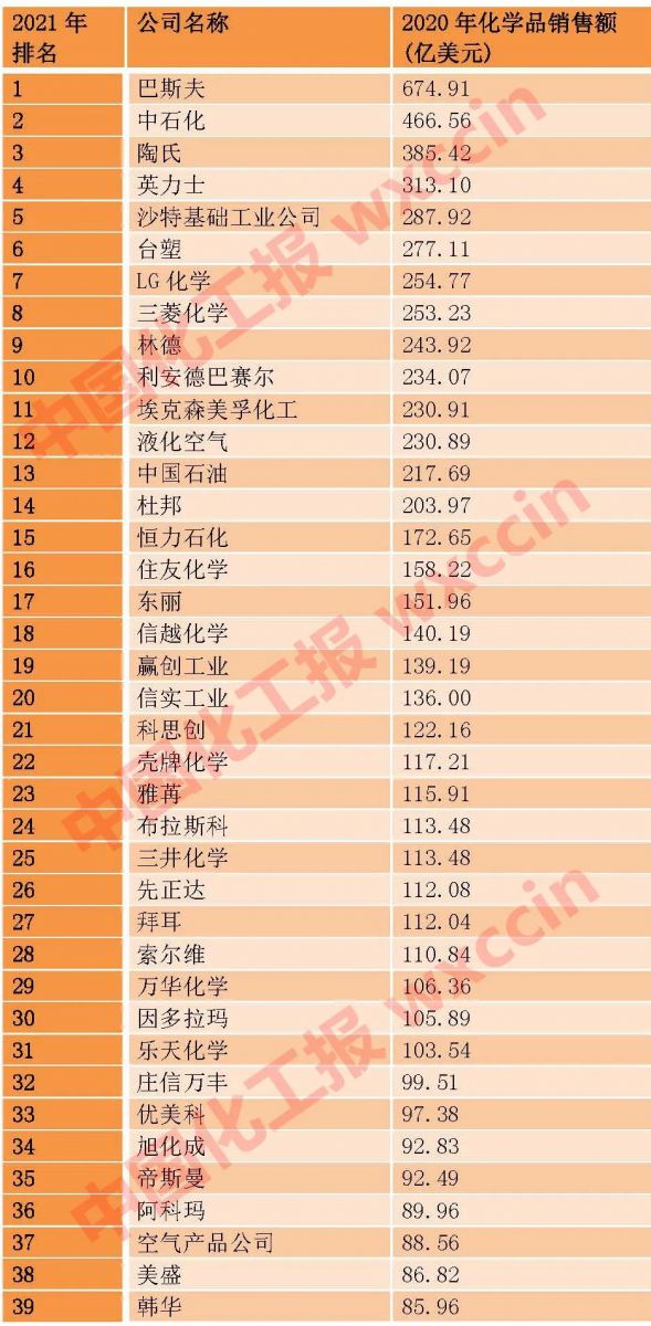 本年度50強收入門檻為64億美元。銷售額超過500億美元的公司僅有巴斯夫一家;銷售額在400億-500億美元減少1家,僅剩中石化;300億-400億美元的有2家,為陶氏和英力士;200億-300億美元的有10家;100億-200億美元的有17家。